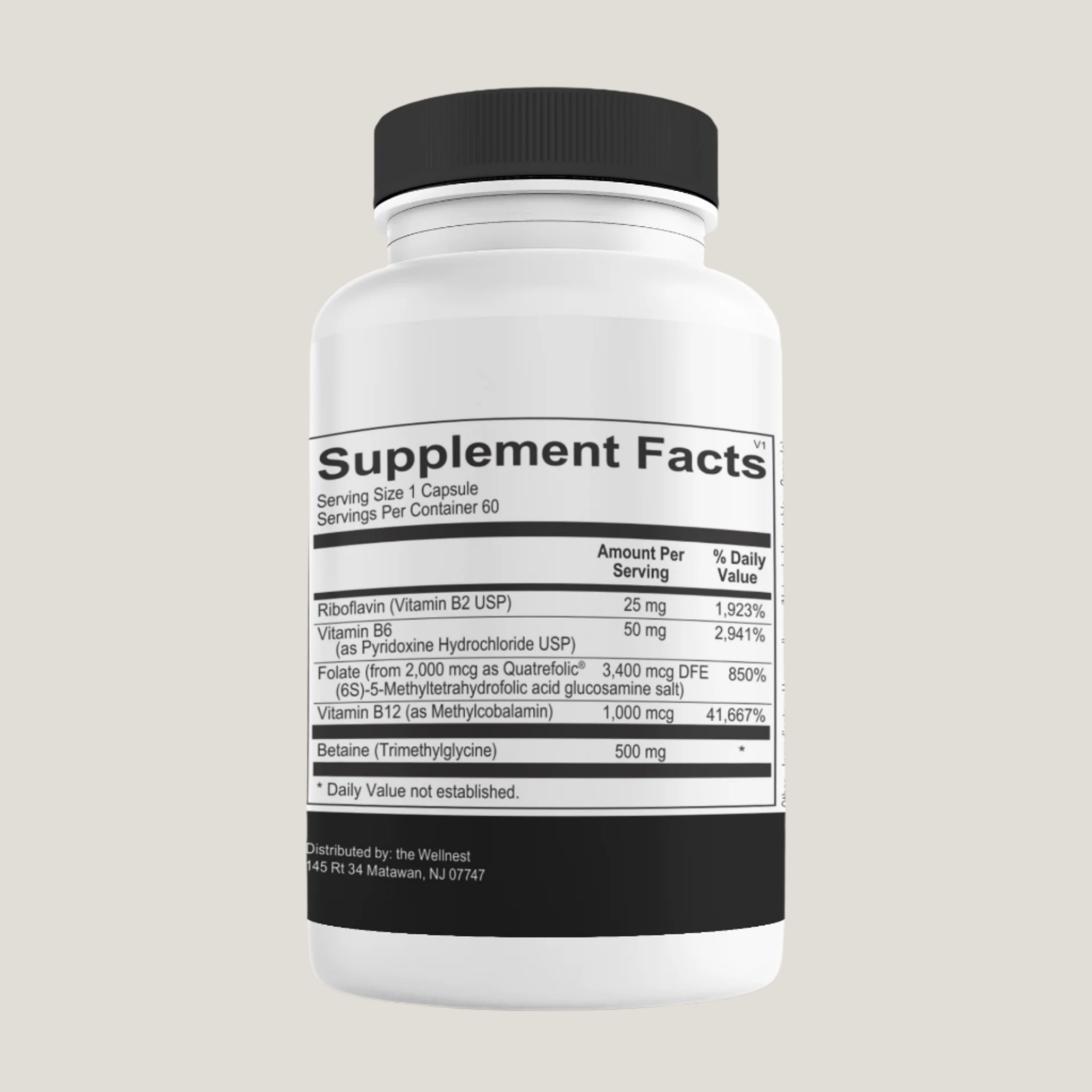 - Includes methylated B12, B6, and B2 for enhanced homocysteine metabolism.