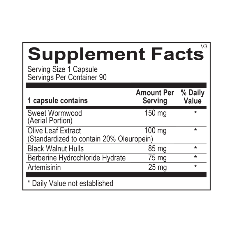 - Contains potent botanicals, including sweet wormwood, olive leaf extract, and black walnut hulls.