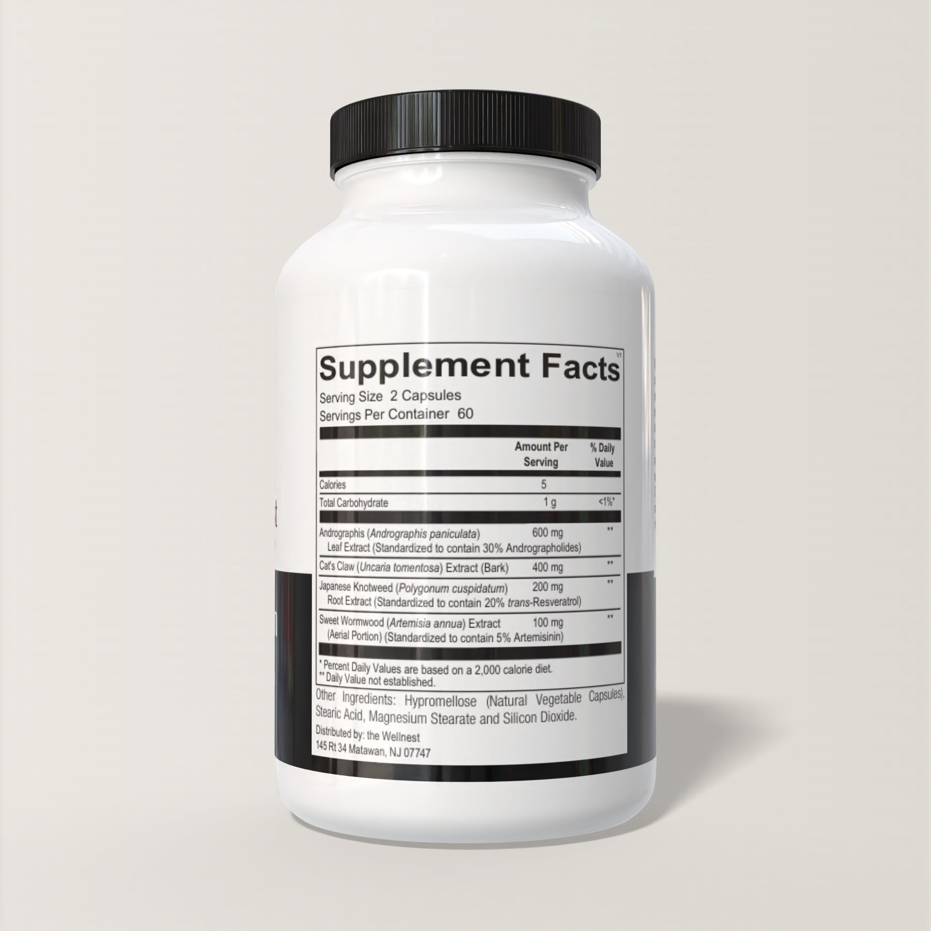 - Contains a blend of Andrographis, cat’s claw, Japanese knotweed, and sweet wormwood.