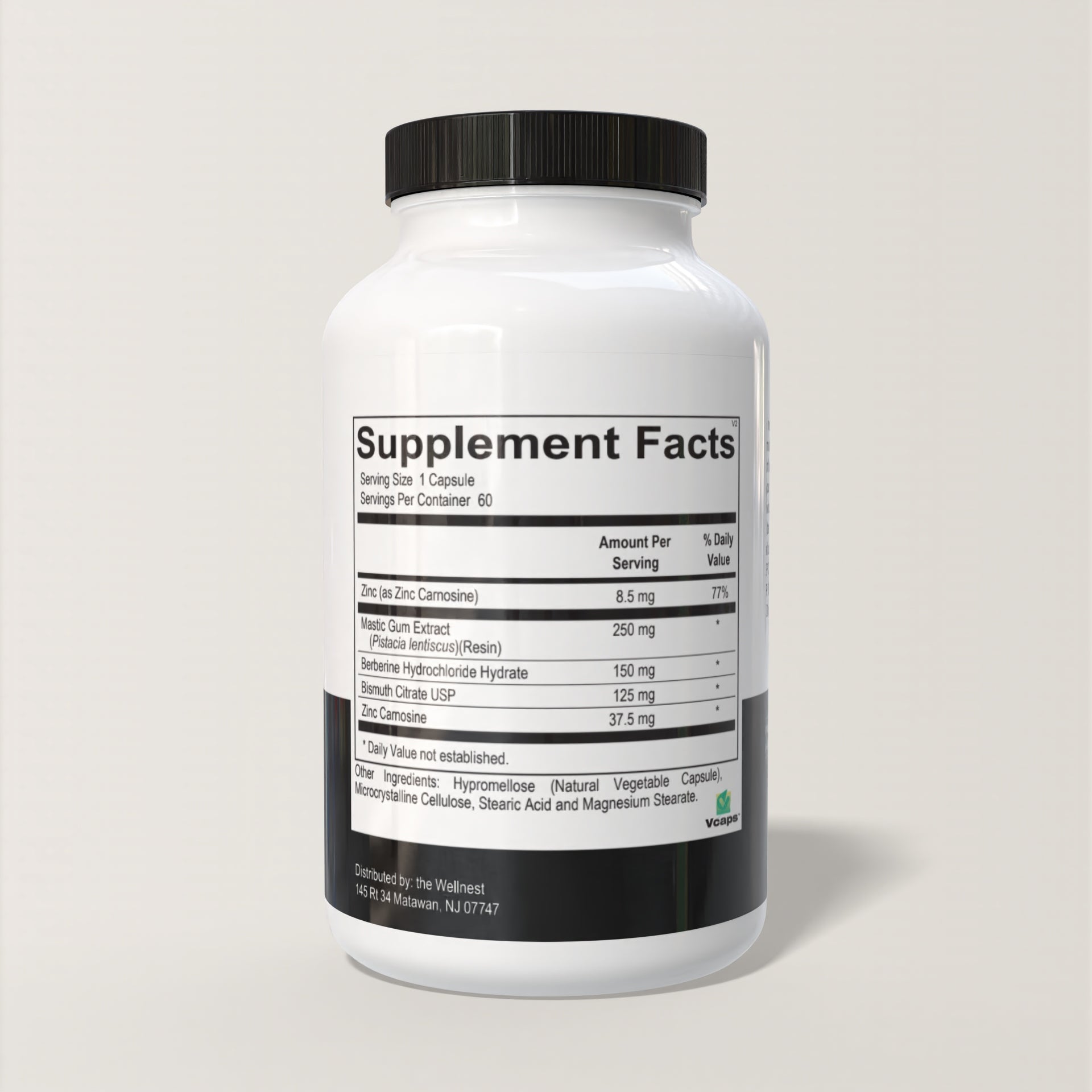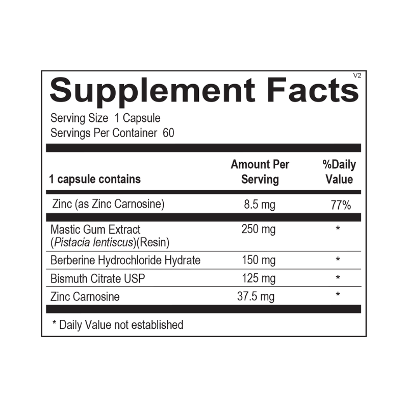 - Contains mastic gum, bismuth citrate, zinc carnosine, and berberine for comprehensive stomach and gut support.