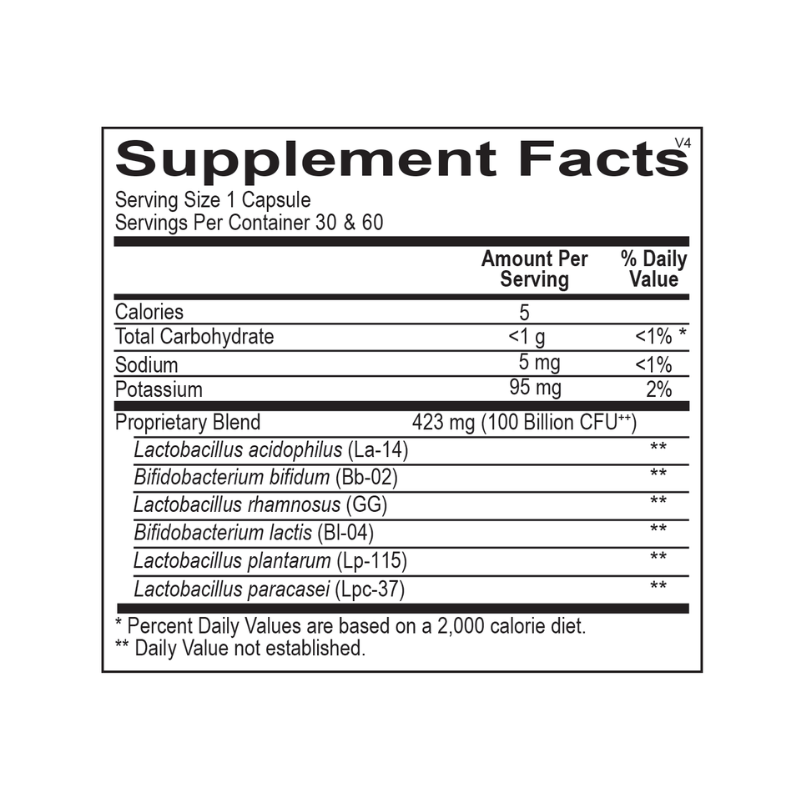 - Contains a blend of six clinically studied probiotic strains, including Lactobacillus acidophilus, Bifidobacterium lactis, and Lactobacillus rhamnosus.